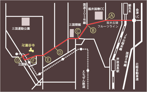 金津I.C.から国道305号線を経由して、三国・東尋坊方面へ約20分。
