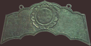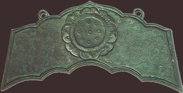 磬(けい)は元来中国古代の楽器であったものが、後に仏教の鳴器として取り入れられたものです。これは、表裏ほとんど同文の銅磬で、全面に鍍金が施されています。山形は低く形は横の長い古風な造りです。撞座は薄肉で大きく広がり、左右の袖は鋳出しとせず、魚々子(ななこ)地に線刻で宝相華文を表わしている点が珍しいものです。回様は典麗で彫技は微妙巧緻をきわめ、その高雅な気品は平安時代工芸の粋を示すものです。(国宝)