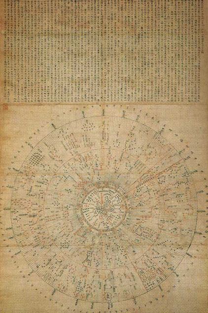 天ノ図は、四代朝倉孝景から寄進されたもので、室町時代中期以前の星図として現存唯一の遺品とみられています。 本図は上段の『歩天歌』と下段の『星図』からなっています。 『歩天歌』は中国の隋のころ星座を詩歌の形に詠んだもので、本図の歩天歌は晁氏志撰「唐歩天歌」(『玉海』所収)とほぼ一致します。 『星図』は、331星座と1554個の星からなります。星座の位置は、正確さを欠きますが、星の番号、名称は「格子月進図」(焼失)と、宿度は賀茂在方著「暦林問答集」(1414年)記載とほぼ一致します。