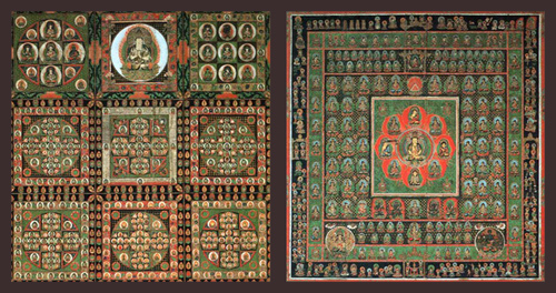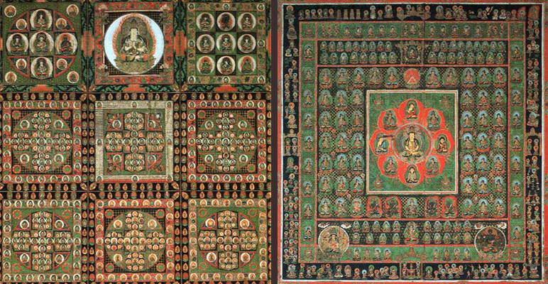 密教の金剛界と胎蔵界、両界が対となった曼荼羅。(室町時代作) 伝法灌頂に用いたもの。